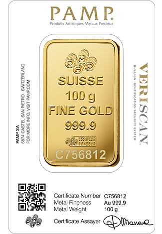 Sztabka PAMP z czystego złota (99,99%) zapakowana w certyfikat CertiPAMP, który chroni samą sztabkę i jednocześnie potwierdza jej autentyczność. Certyfikat zawiera również unikalny numer seryjny sztabki oraz informacje takie jak, zawartość, masa i czystość złota.
