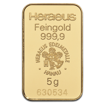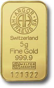 Sztabka z czystego złota (99,99%) o masie 5 g.