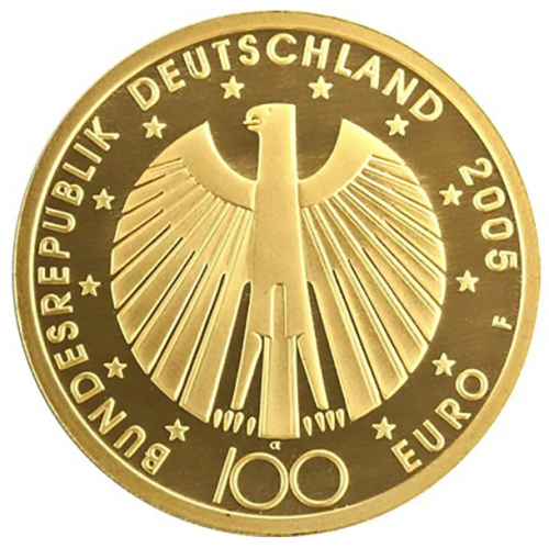 Z kolei awers złotej monety 100 euro przedstawia niemieckiego orła, 12 gwiazd Unii Europejskiej, napis BUNDESREPUBLIK DEUTSCHLAND (Republika Federalna Niemiec), nominał 100 euro, rok wybicia oraz znak mennicy: A (Berlin), D (Monachium), F (Stuttgart), G (Karlsruhe) lub J (Hamburg). Każda z tych mennic wyprodukowała określoną liczbę monet, co czyni niektóre z nich bardziej poszukiwanymi przez kolekcjonerów. 100 euro to moneta inwestycyjna, choć ze względu na zróżnicowane motywy można ją zaliczyć również do grona monet o wartości kolekcjonerskiej.