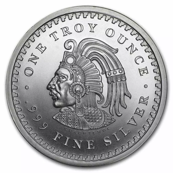 - Rewers (druga strona): Zazwyczaj przedstawia portret Cuauhtémoca, ostatniego cesarza Azteków z Tenochtitlánu, noszącego tradycyjny aztecki pióropusz. Wokół portretu znajduje się ozdobna granica oraz inskrypcje określające wagę i czystość metalu, np. "1 TROY OZ .999 FINE SILVER".