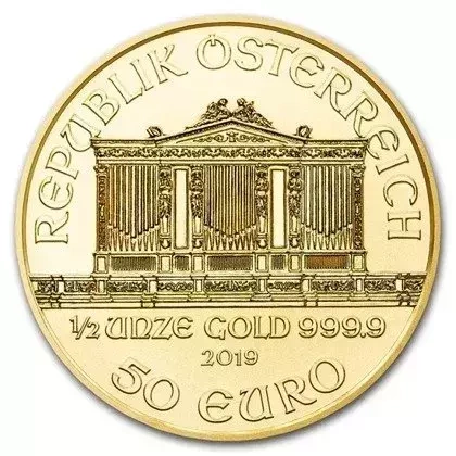 Monety zdobią wielkie organy hali koncertowej w Wiedniu, gdzie orkiestra ma swoją siedzibę. Na górze awersu znajduje się napis "REPUBLIK ÖSTERREICH", na dole "1/2 UNZE GOLD 999.9", data produkcji oraz nominał "50 EURO".