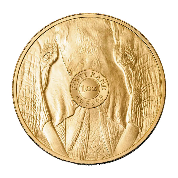 Złota moneta Słoń wybita przez Mennicę Południowoafrykańską, ta wybitna moneta zawiera 1 uncję trojańską złota próby 9999. i posiada nominał 50 randów.