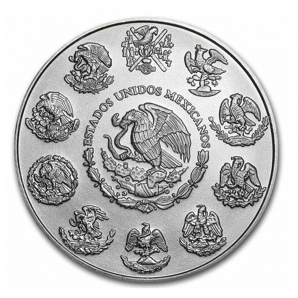 Godło narodowe pojawia się na rewersie srebrnej monety meksykańskiej Libertad 2021 nie raz, ale 11 razy. Większy, centralny wzór to współczesna pieczęć narodu przedstawiająca potężnego orła przedniego walczącego z grzechotnikiem na kaktusie z opuncji. Pieczęć otoczona jest wieńcem i napisem Estados Unidos Mexicanos. Zewnętrzne pole zawiera 10 historycznych wersji tego samego projektu używanego w całej historii Meksyku.