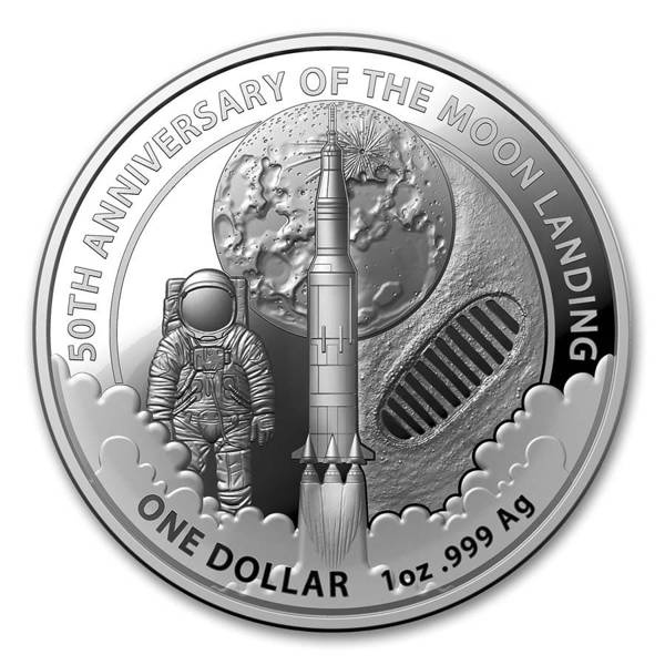 Ukazuje najważniejsze symbole kojarzone z misją Apollo 11. W centralnej części rewersu uwieczniono startującą rakietę Apollo 11 na tle księżyca. Prawą krawędź zdobi pozostawiony na księżycu odcisk buta. Lewą krawędź ozdabia postać astronauty w skafandrze. Całość otacza napis „ 50TH ANNIVERSARY OF THE MOON LANDING” oraz takie informacje jak wartość nominalna, waga monety oraz próba kruszcu. Za doskonały projekt rewersu odpowiada znakomity projektant Adam Ball.
