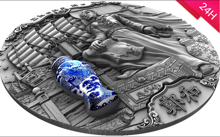 Widzimy admirała Zheng He, który nieustraszenie spogląda ku nowym lądom na horyzoncie. W tle znajduje się statek baochuan – największa z jednostek floty chińskiego admirała. Dodatkową ozdobą i kolorowym akcentem jest ręcznie malowana wstawka z porcelany, oddająca najdrobniejsze szczegóły.