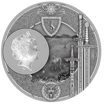 Po lewej stronie awersu widnieje wizerunek królowej Elżbiety II oraz informacje o próbie srebra, nominale i emitencie. Widoczne są również symbole związane z Wiedźminem - jednorożec, miecze i medalion Białego Wilka.