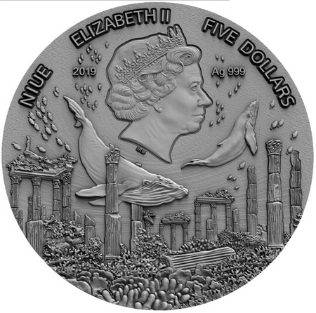 AWERS: Na awersie monety ukazane są ruiny Atlantydy spoczywające na dnie morza oraz wizerunek królowej Elżbiety II.