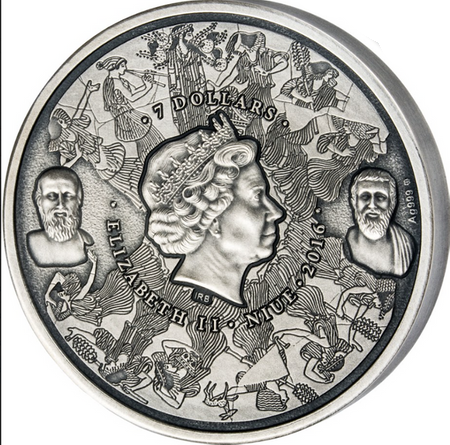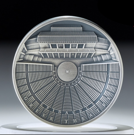 REWERS: Dzięki wklęsłej formie rewers monety znakomicie oddaje budowę starożytnego teatru. Precyzyjne wykonanie i wysoki relief umożliwiają podkreślenie szczegółów monety, a zwłaszcza teatronu, czyli miejsca, w którym podczas przedstawień teatralnych zasiadała publiczność. Moneta wykonana jest z 3 uncji oksydowanego srebra o próbie 999, co jeszcze podkreśla jej starożytny charakter i wyróżnia ją spośród innych srebrnych monet.