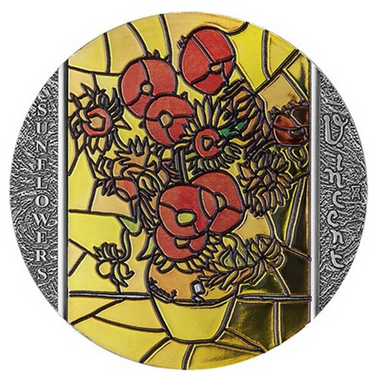 REWERS: Na rewersie przedstawiona została reprodukcja jednego z dzieł Vincenta Van Gogha Słoneczniki. Moneta zachwyca połączeniem techniki druku cyfrowego i antycznego wykończenia.