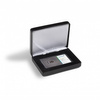 Wnętrze pudełka: miejsce na sztabkę w blistrze wyłożone czarnym, aksamitnym materiałem, poduszka wieka biała z satynową tasiemką, także w kolorze białym - służąca do umieszczania certyfikatów lub innych oznaczeń czy informacji o monecie, pudełko jest trwałe i wytrzymałe oraz zajmuje niewiele miejsca. Prosty kształt pozwala na wygodne przechowywanie pudełka.